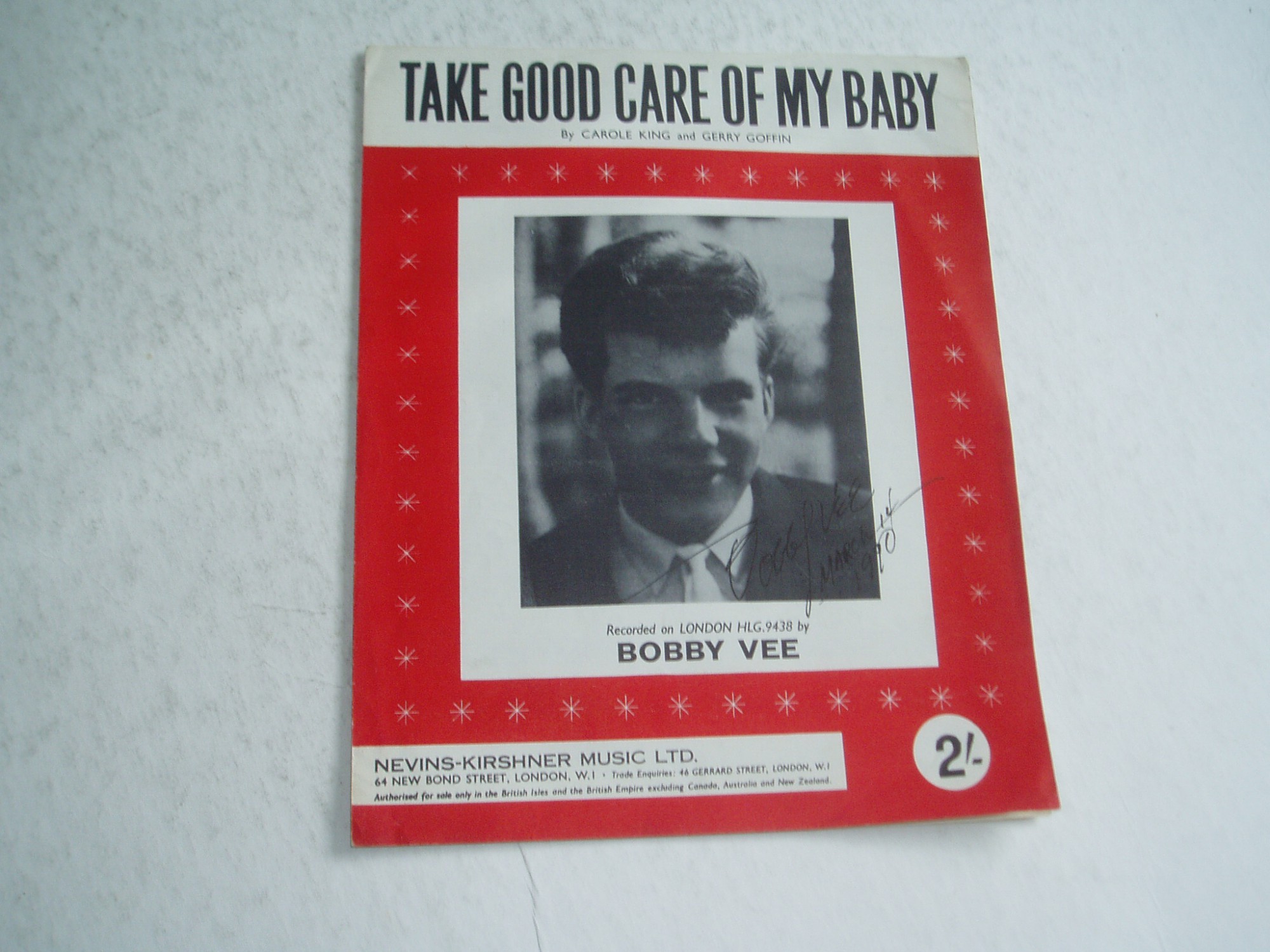 A very desirable original complete SHEET MUSIC  of hit song    "TAKE GOOD CARE OF MY BABY"....On which it  has SUPERB  hand signed signature  of  terrific  American  recording star ........BOBBY VEE.................All items can be bought with absolute confidence. There's a  guarantee of authenticity, and should any item prove unsatisfactory for any reason, a full refund will be given if it is returned in its original condition within 30 days....................any questions please E Mail me.........................Thank you for looking