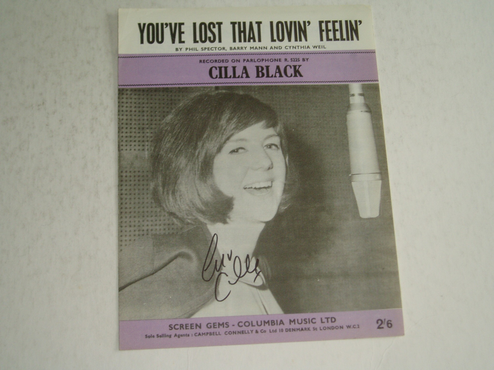 A superb original SHEET MUSIC...for "YOU'VE LOST THAT LOVIN FEELIN"....recorded by CILLA BLACK   .complete...On the FRONT cover  it  has SUPERB   hand signed signature  of  terrific British recording  star .......CILLA BLACK....,....................All items can be bought with absolute confidence. There's a  guarantee of authenticity, and should any item prove unsatisfactory for any reason, a full refund will be given if it is returned in its original condition within 30 days.........Any questions please message me.............Thank you for looking