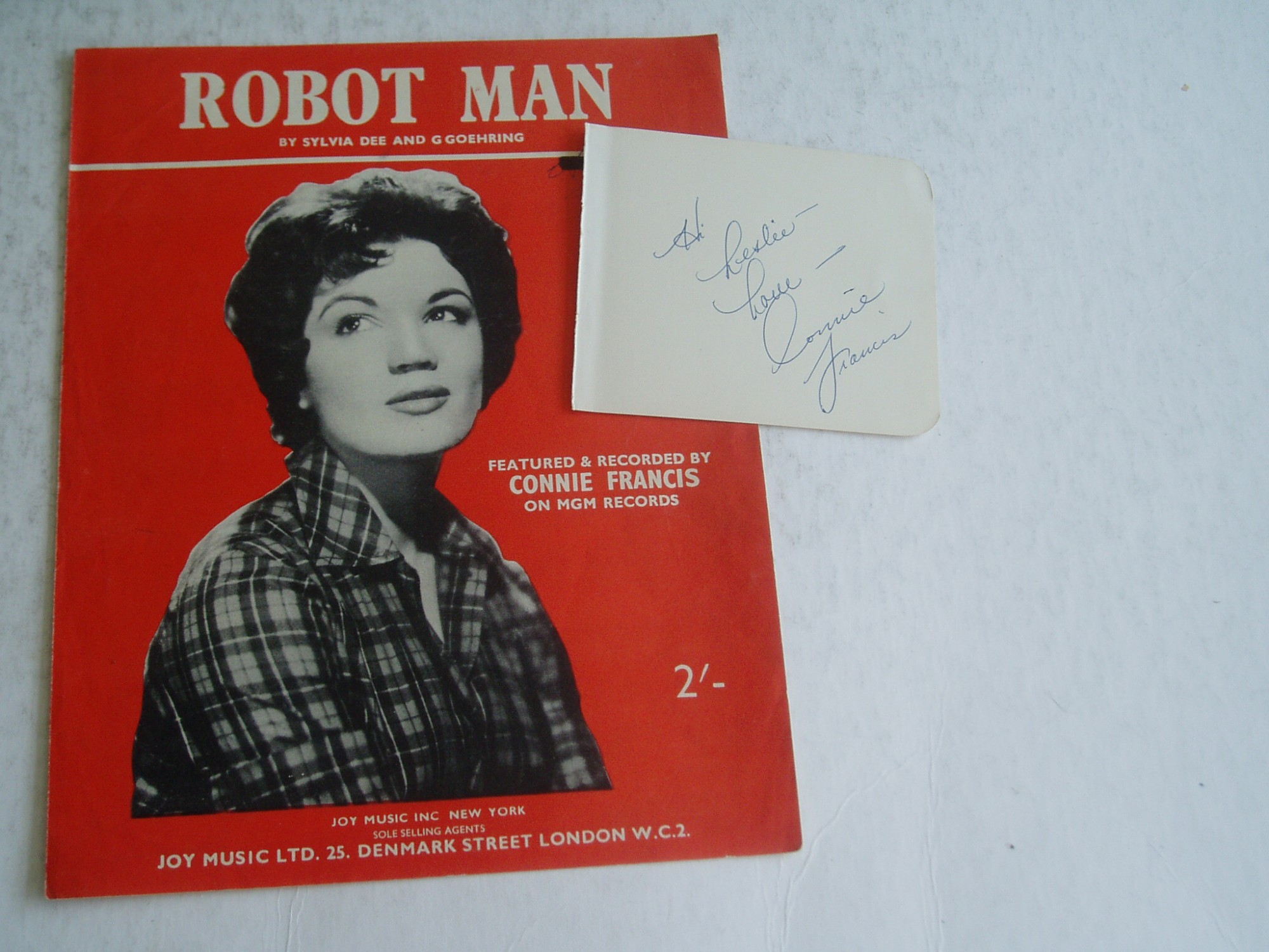 A PAGE from 1960's Autograph Book PLUS A superb original SHEET MUSIC...for "ROBOT MAN"....recorded by CONNIE FRANCIS .complete...On the PAGE it has SUPERB hand signed signature of terrific...