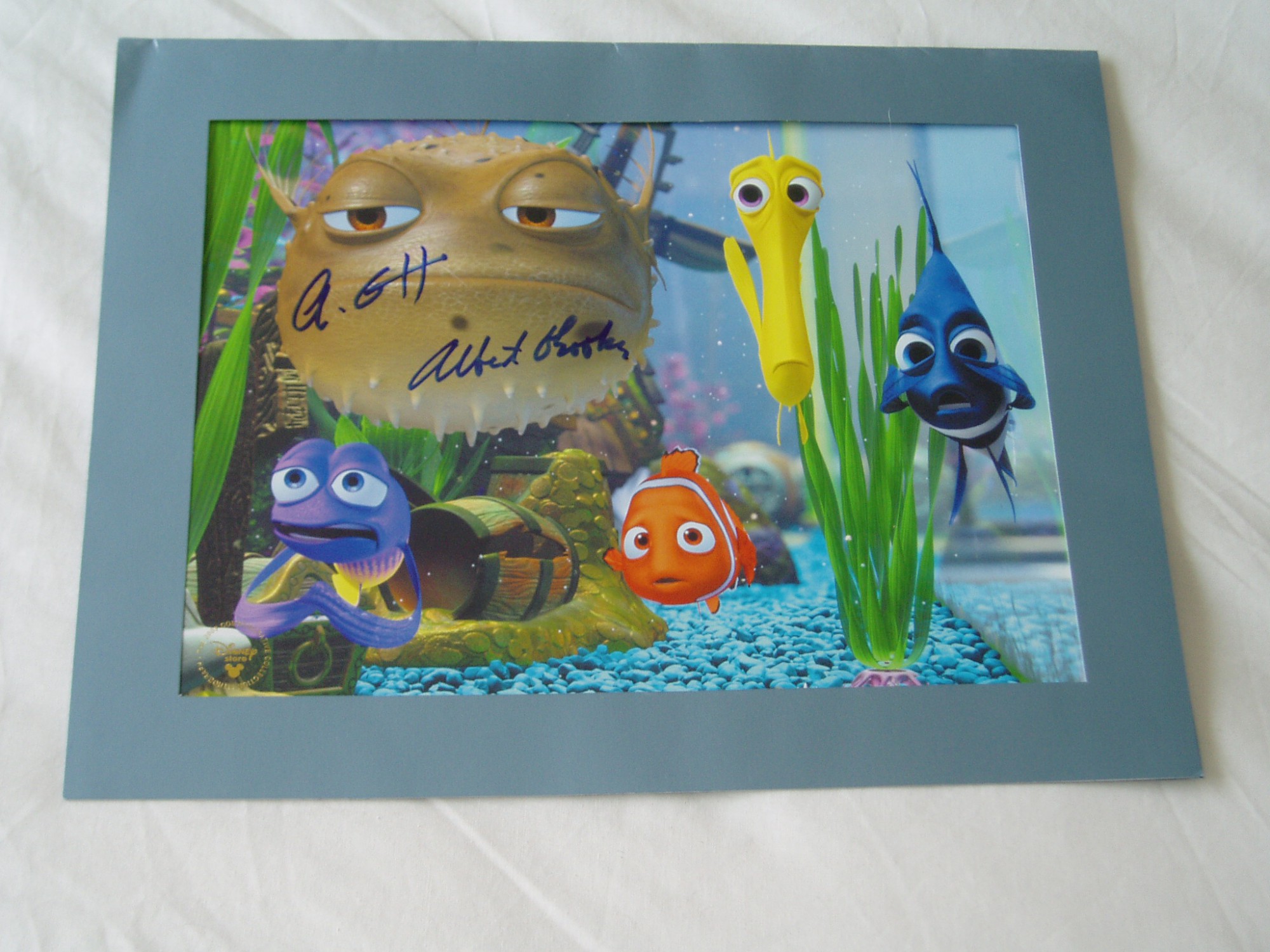 FINDING NEMO......A very desirable original poster PHOTOGRAPH from Disney studios......size is 14 x 11 inches......On which it has SUPERB hand signed signatures of fine FINDING NEMO...voice of characters film stars........... ..ALBERT BROOKS and ALEXANDER...