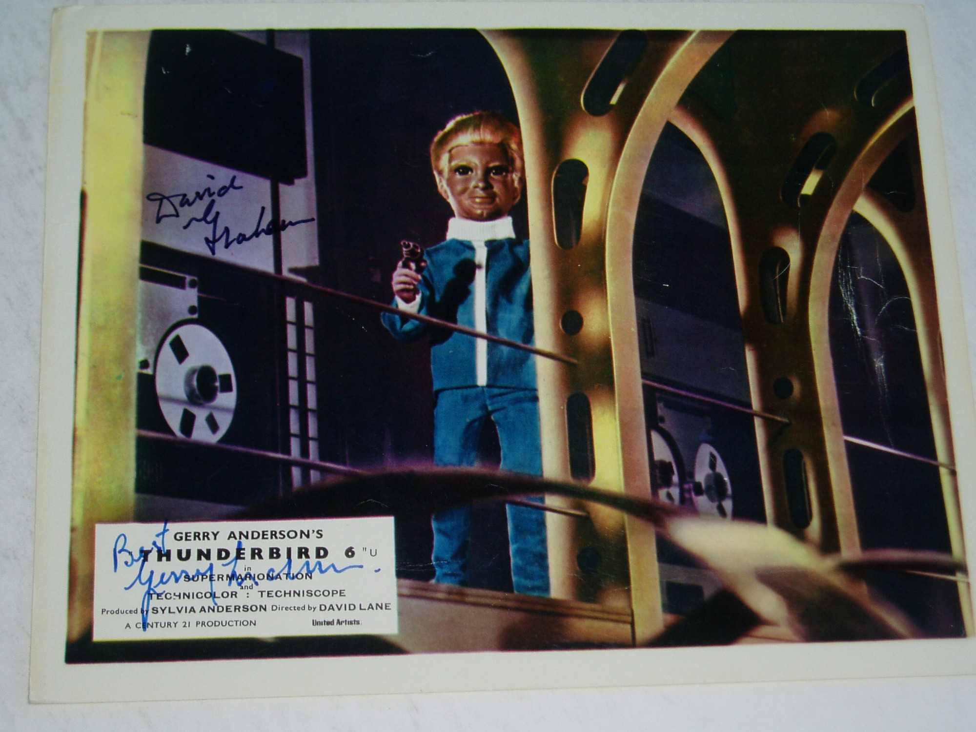 A superb publicity photograph   "THUNDERBIRDS   6 "  .size is 10 x 8 inches....On which it  has SUPERB hand signed signatures  of  terrific British film  stars ........GERRY  ANDERSON   and DAVID GRAHAM      .................................All items can be bought with absolute confidence. There's a  guarantee of authenticity, and should any item prove unsatisfactory for any reason, a full refund will be given if it is returned in its original condition within 30 days.........................any questions please E Mail me.......................Thank you for looking