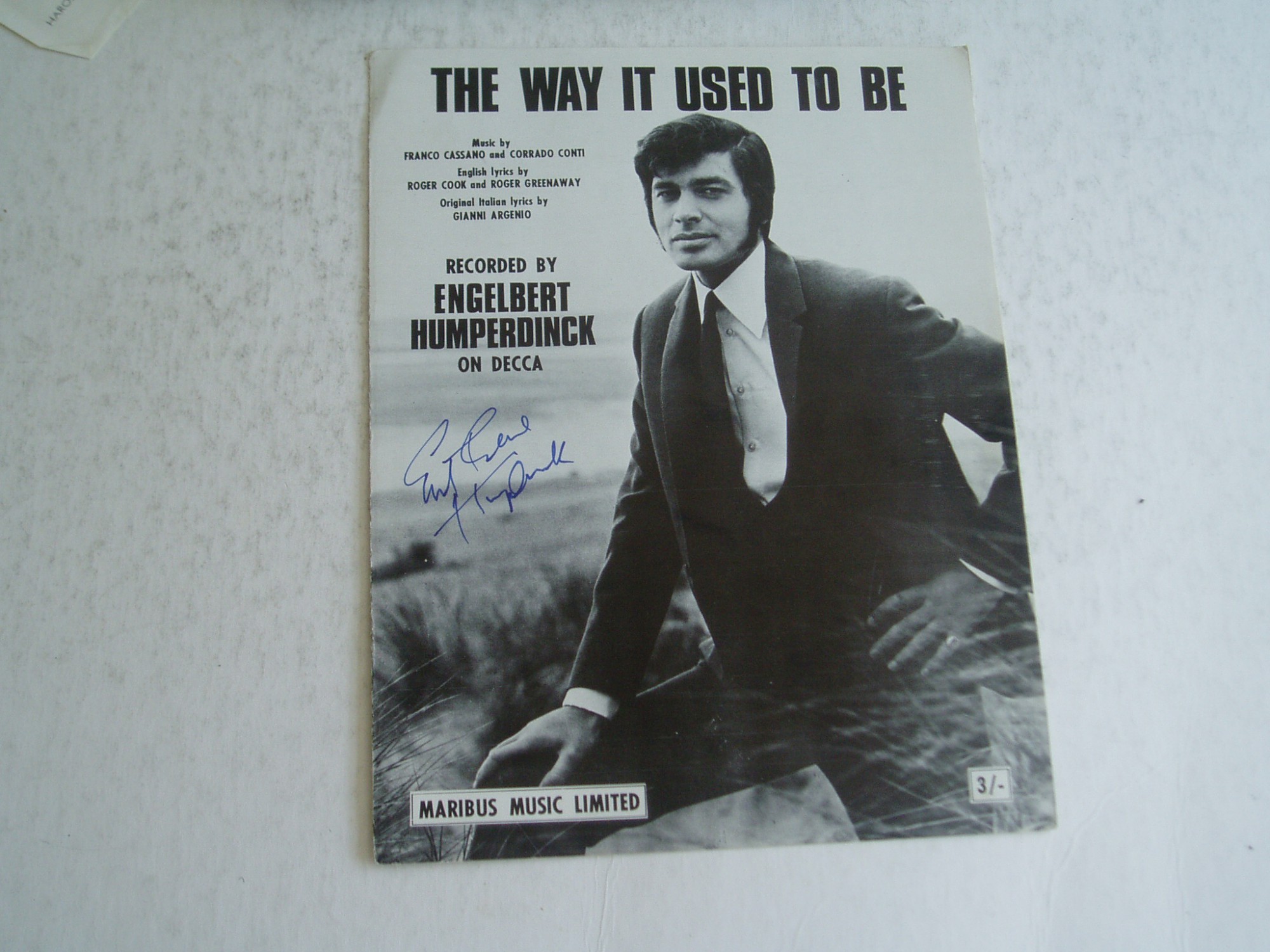 A superb original SHEET MUSIC...for "THE WAY IT USED TO BE "....recorded by ENGELBERT HUMPERDINCK .complete...On the FRONT cover it has SUPERB hand signed signature of terrific British recording star .........