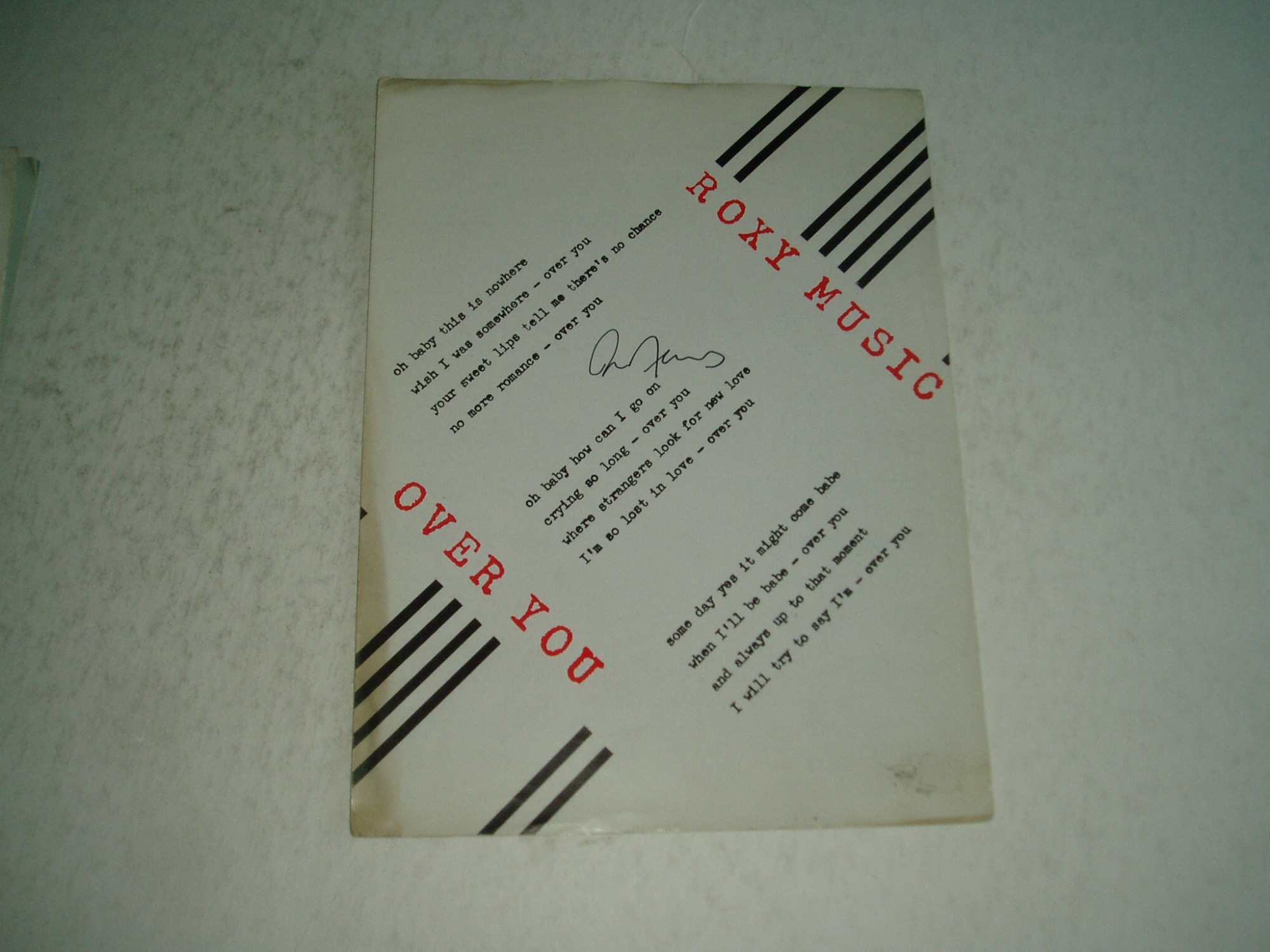 A superb complete original sheet music for OVER YOU recorded by ROXY MUSIC....On which it has SUPERB hand signed signature of terrific ROXY MUSIC singing star ...... ...BRYAN FERRY.... ............... All items can be bought with...